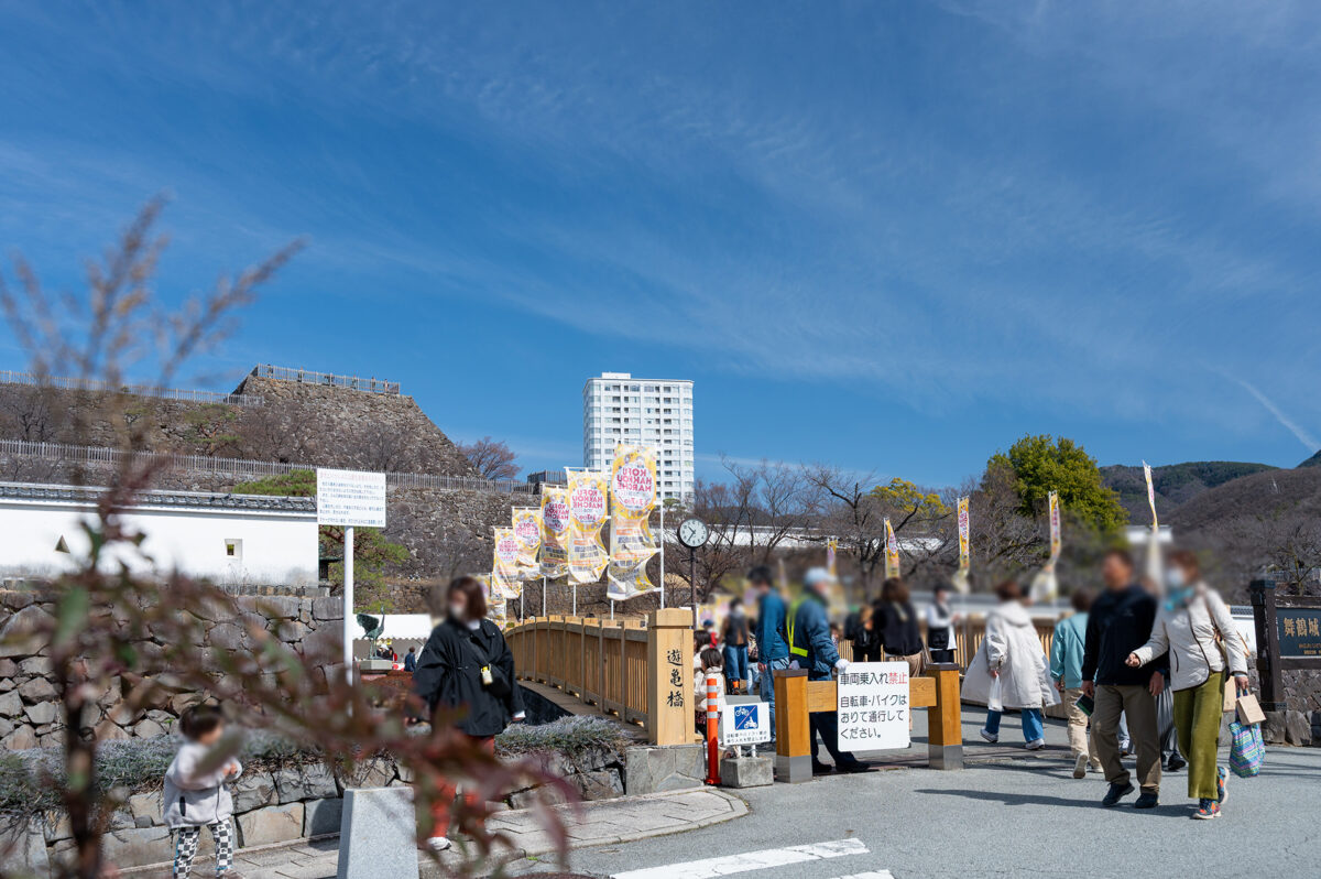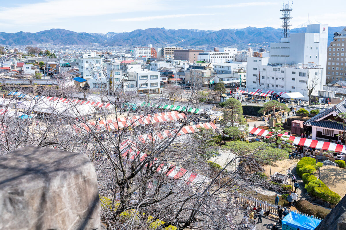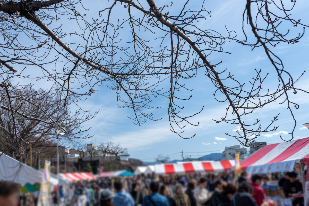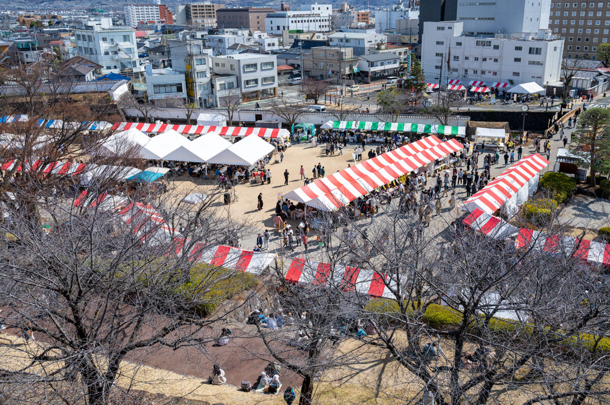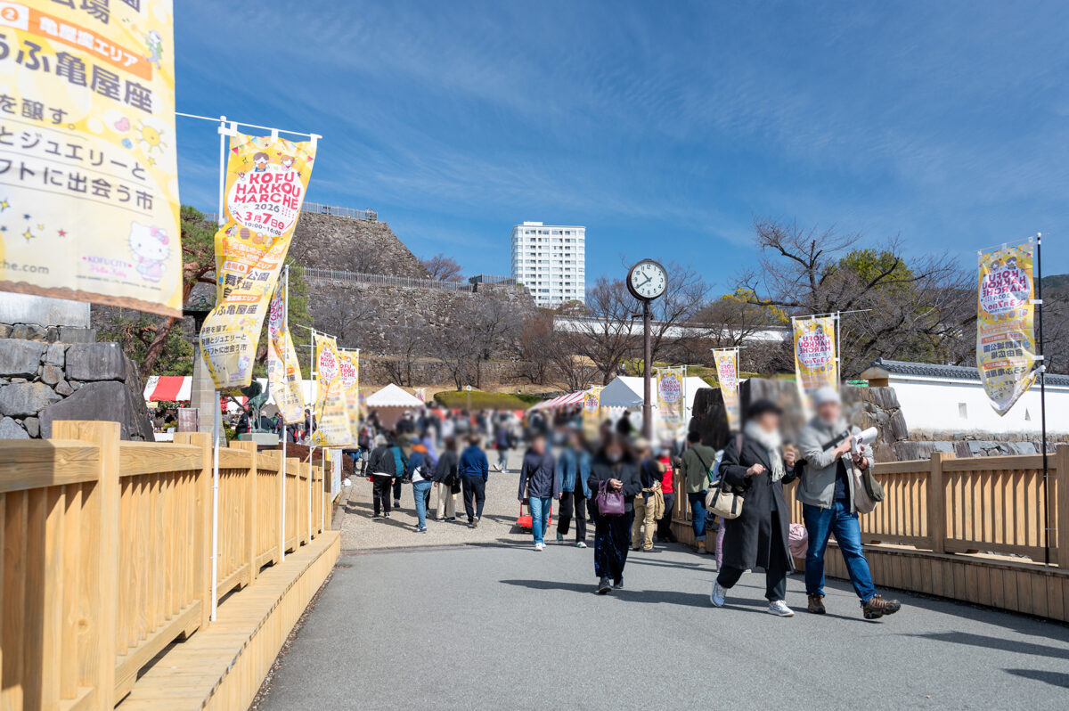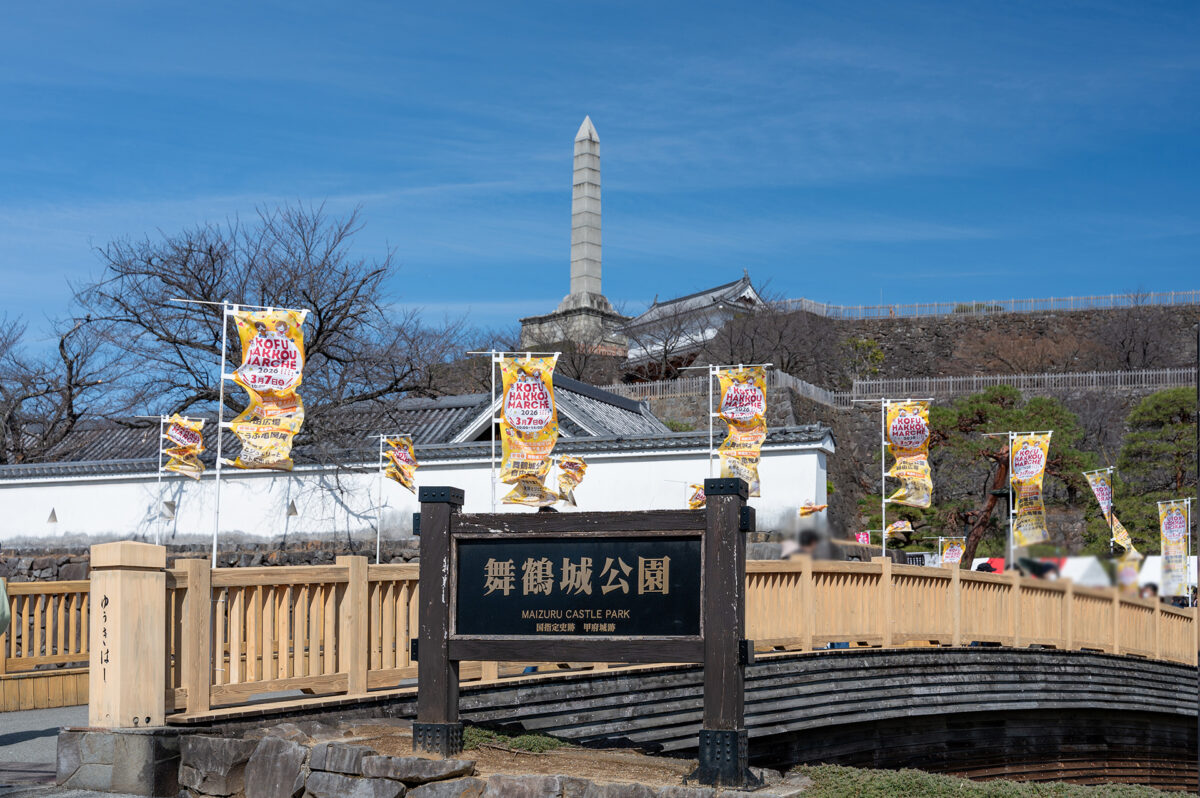 舞鶴城公園の自由広場は、甲府の食文化を発信するイベント「こうふはっこうマルシェ」の開催場所のひとつです。舞鶴城公園は、甲府駅からほど近い場所に広がる甲府城跡を整備した歴史公園で、重厚な石垣や城郭の面影が今も残り、かつて甲斐の国の中心として栄えた城下町・甲府の歴史を身近に感じることができます。